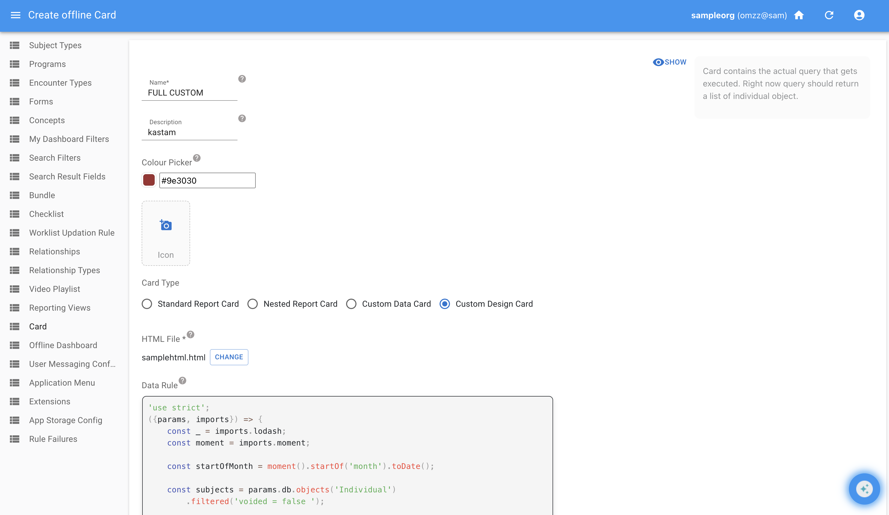 Card configuration — including action settings (action type, subject type, program, encounter type, visit type) and custom design card HTML — is included in the organisation bundle export/import. All card settings are preserved across bundle upload. No additional configuration is needed after import.